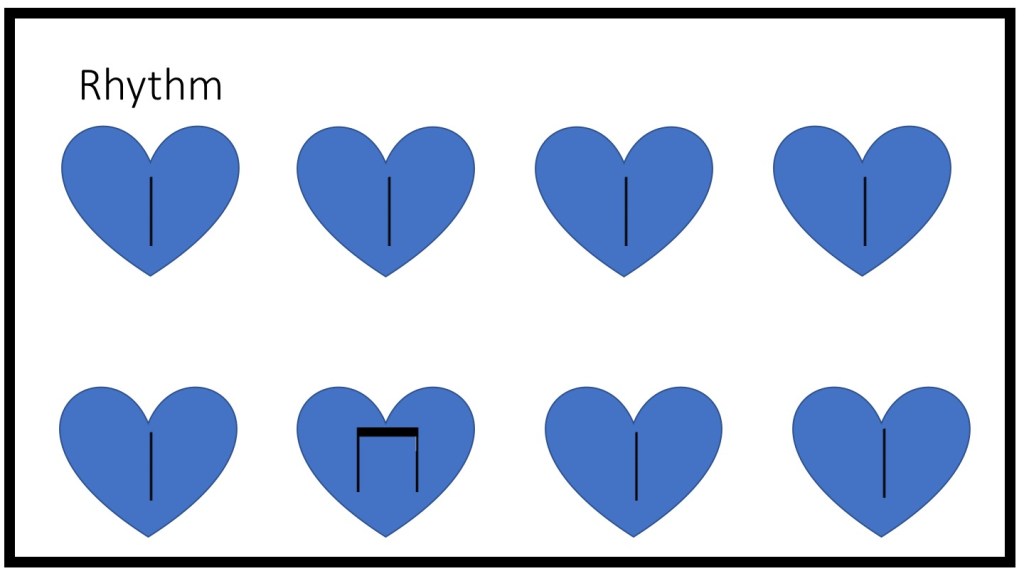 The Kodály Method of music education is how I was taught as a child; to give a brief summary, it emphasizes aural skills, solfedge, and the use of folk songs to teach every child music through the instrument every child has: the voice. I still use principles from the Kodály Method in my own teaching, including, on this occasion, rhythm reading with heartbeat and stick-only notation. This can be taught to children of any age, but is especially helpful for younger students. Like many aspects of music, it is better taught through modeling than explanation.