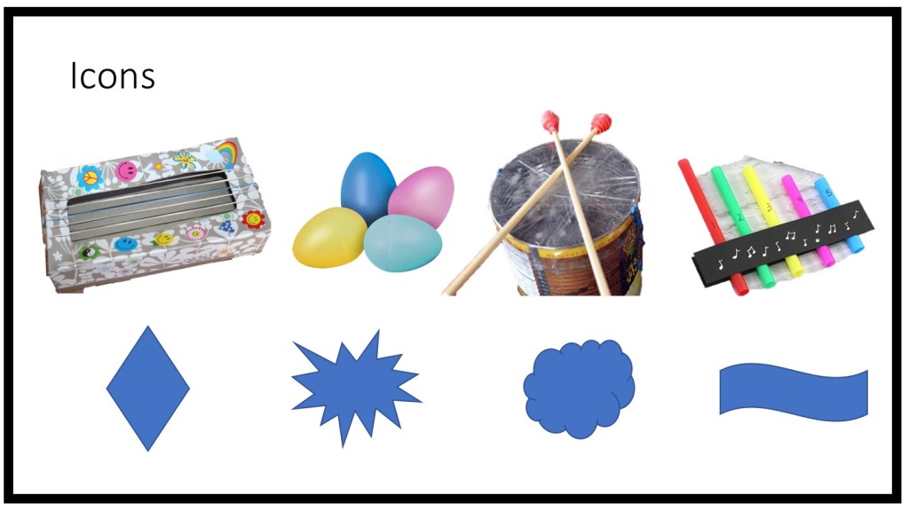 The US National Standards for music teaching can be summarized in four words: Create, Perform, Respond Connect. This Sound and Vibration curriculum has sought in incorporate all four of these standards, but particularly in these last two lessons I have given a special focus to the Create standard. These first graders not only created their own instruments from recycled materials, but they also had a hand in creating the song we performed to summarize our learning by choosing the iconic notation we used and helping set the form of the piece.