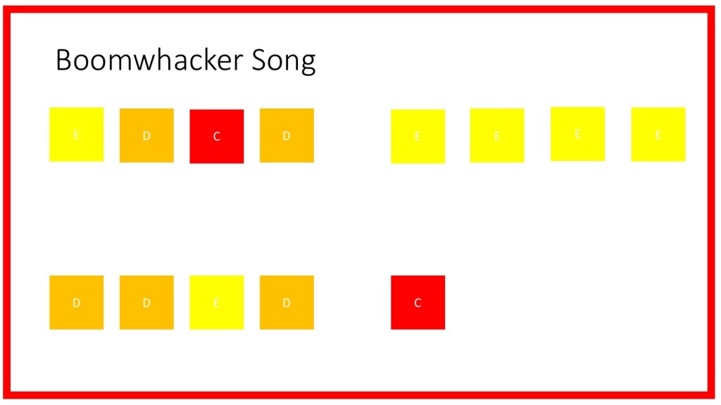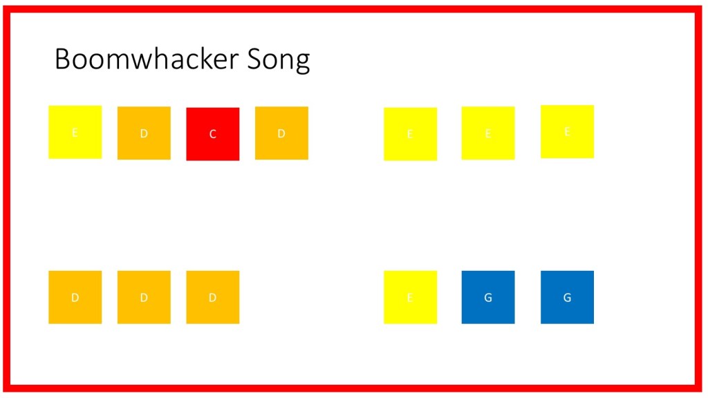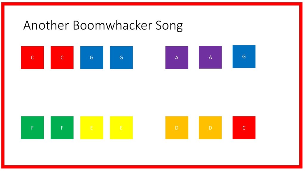 I created some simple iconic notation for the Boomwhackers, color-coding squares to match the color of the tubes and arranging them into simple songs, and displayed them in a PowerPoint. This activity requires focus and teamwork, as the students have to play only when their assigned note comes up in the song. With a little practice, these first graders did a great job! They correctly identified both songs, which demonstrated to me as well as them their own ability to play together as an ensemble. Pretty impressive!
