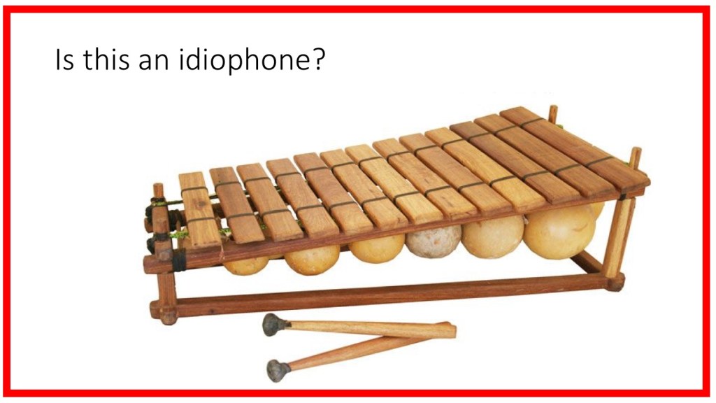 I explained the concept simply: “Last time we talked about membranophones. In a membranophone, the vibrating material is the drumhead. In an idiophone, the vibrating material is the instrument itself. Here’s another slow-motion video: Watch what happens to this cymbal when it is struck by a drumstick! You can see that what is vibrating is the instrument itself. Even though we can’t see it with most idiophones, (because it happens so fast!) it’s always the instrument itself that vibrates.”