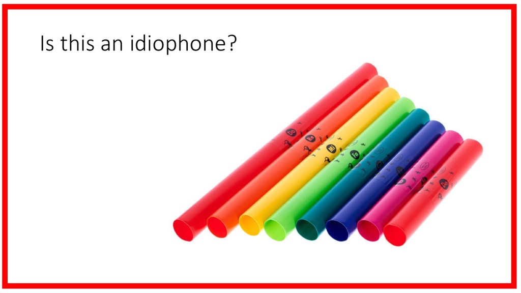 Using another short clip from YouTube helped explain the basics of idiophones. As with each category of instrument, it is defined by its vibrating material, which is why studying instrument families worked so well for this unit on Sound and Vibration. Idiophones are a fairly complex instrument family, so I used another PowerPoint with examples and nonexamples to help them understand.