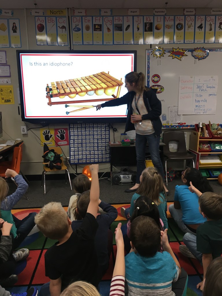To show their vote for “idiophone” or “not an idiophone,” I asked the students to show a thumbs up or thumbs down rather than calling out. By holding their thumbs under their chins (a suggestion from Mrs. Nelson), I was better able to assess each child without them influencing each other’s votes quite as much. This was a great formative assessment strategy I plan to use again in future lessons!