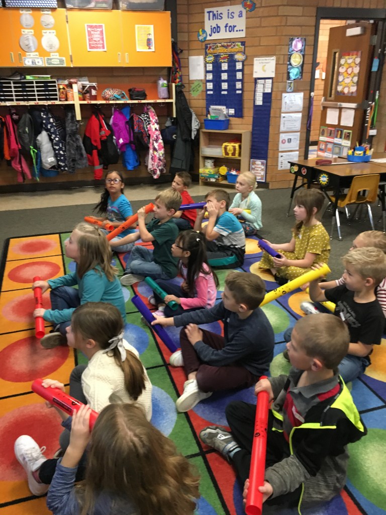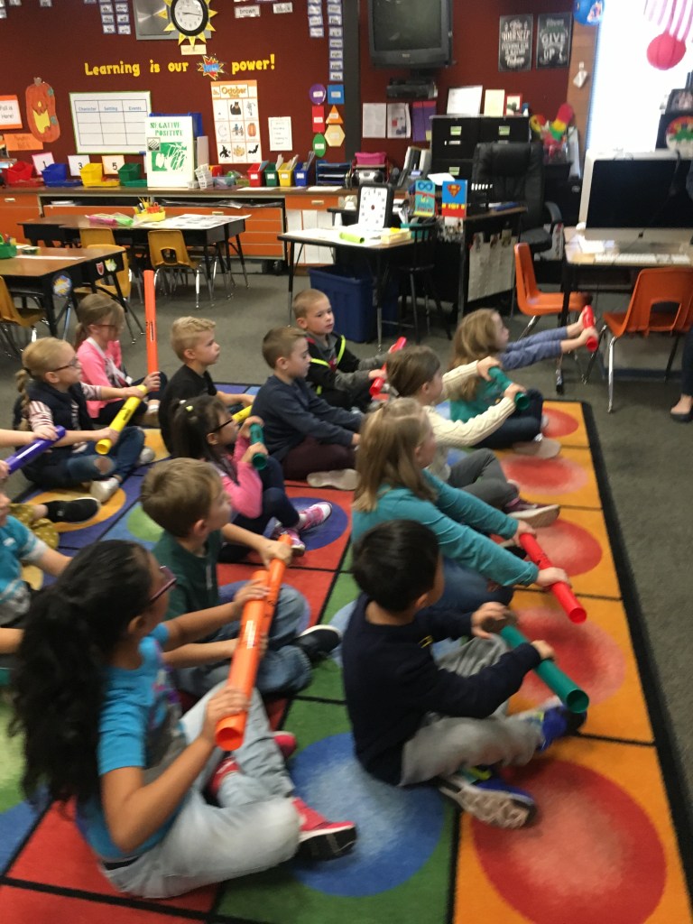 Pretty simple, but it works! When you’re holding a Boomwhacker with both hands, you can’t bang it into anything. It also helps to give the students a bit of time at the beginning and end to just make a bunch of noise with their instrument. It’s a lot of fun and it lets them get that urge out so they can focus better the rest of the time. These procedures need to be repeated several times, of course, throughout the activity, and it was very nice to have Mrs. Nelson in the classroom to assist with modeling and enforcing these procedures. But they worked, and on the whole, everything went smoothly.